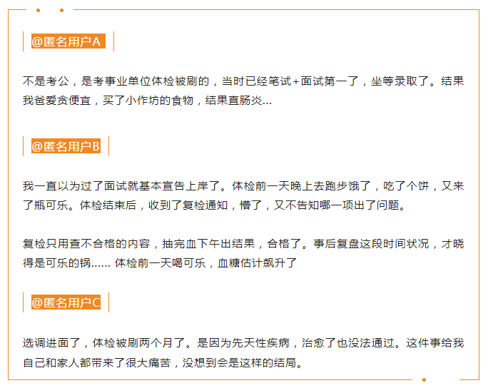 最近在一個“公務(wù)員體檢被刷是什么感受”的帖子下看到的考生留言:
