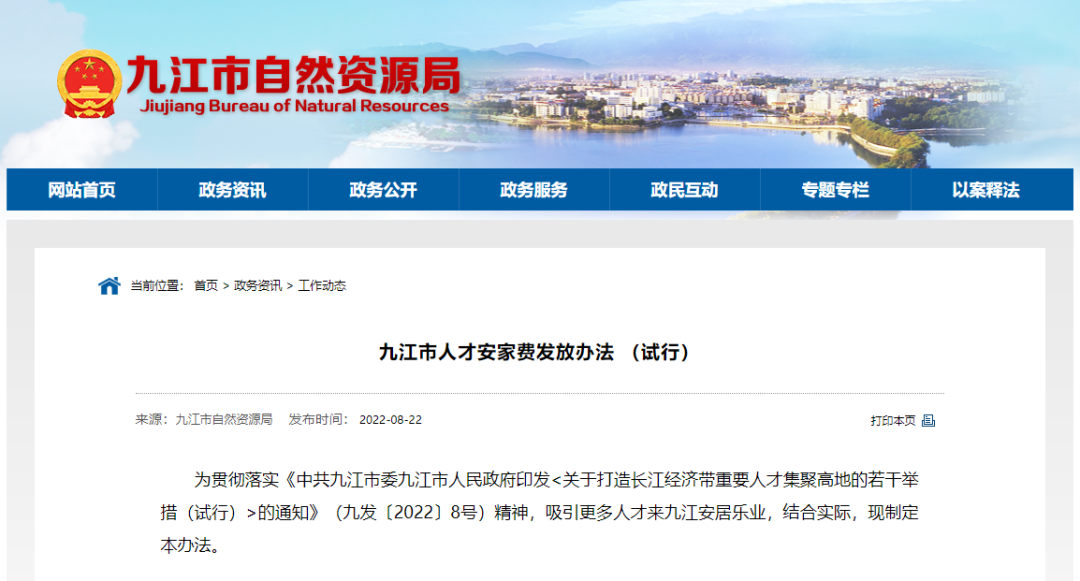 8月22日,小編從九江市自然資源局網(wǎng)站獲悉,為吸引更多人才來(lái)九江安居樂(lè)業(yè),結(jié)合實(shí)際,現(xiàn)制定九江市人才安家費(fèi)發(fā)放辦法 (試行)。